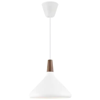 Die Nordlux Pendelleuchte aus der Modellreihe Nori zeichnet sich durch ein modernes Design und einen schicken Materialmix aus. Der Lampenschirm besteht aus Metall. Das Markenzeichen der Modellserie ist die Holzspitze in geöltem Nussbaum. Hinweis: Die Leuchte kommt ohne Leuchtmittel daher - passende E27 LED-Lampen finden Sie jedoch in unserem Shop.