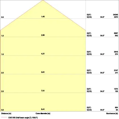 Beispiel: Wird eine Lampe mit einem Abstrahlwinkel von 60 Grad an der Decke (2,5 m Höhe) angebracht, erzeugt sie einen Lichtkegel von 2,9 Metern Durchmesser. Hat die Lampe hingegen einen Abstrahlwinkel von 120 Grad, beträgt der Lichtkegel 8,7 Meter im Durchmesser. |
