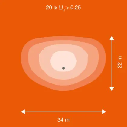 Beispiel: Wird eine Lampe mit einem Abstrahlwinkel von 60 Grad an der Decke (2,5 m Höhe) angebracht, erzeugt sie einen Lichtkegel von 2,9 Metern Durchmesser. Hat die Lampe hingegen einen Abstrahlwinkel von 120 Grad, beträgt der Lichtkegel 8,7 Meter im Durchmesser. |