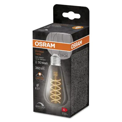 Die Ledvance Vintage 1906 LED E27 Edison Smoke 7.8W 360lm - 818 Extra Warmweiß | Dimmbar - Ersatz Für 30W ist eine effiziente E27 LED-Lampe mit Retrodesign und der perfekte Ersatz für Ihre konventionellen 30W Lampen mit E27. Zudem strahlt sie Licht in der Farbtemperatur 1800K - Extra Warmweiß aus und punktet durch eine lange Lebensdauer.