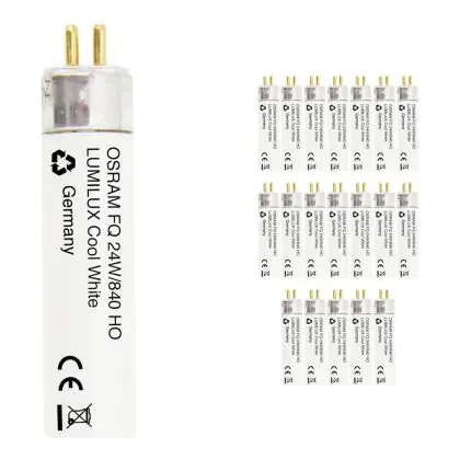 Die Mehrfachpackung 20x Osram Lumilux T5 FQ HO 24W - 840 Kaltweiß | 55cm ist eine T5 Leuchtstoffröhre von Osram mit einer Länge von 550 mm. Das Produkt verfügt über 2 Pins und hat einen Durchmesser von 16 mm. Die Röhre strahlt Licht in der Farbtemperatur 4000K - Kaltweiß aus und punktet durch eine lange Lebensdauer.