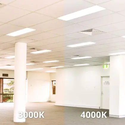Das LED-Panel kommt mit der Farbtemperatur 3000K - Warmweiß daher. Als Faustregel gilt: Je niedriger der Kelvinwert, desto gemütlicher wirkt das Licht.