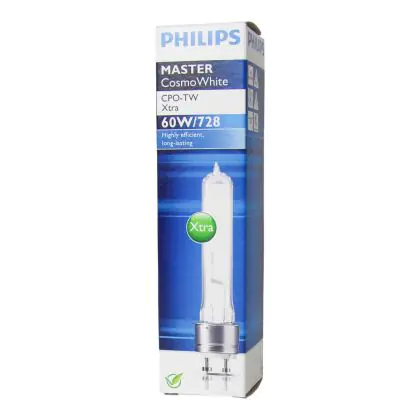Philips CosmoWhite CPO-TW Glühbirnen sind eine neue Generation von Entladungslampen, die zuverlässig und effizient weißes Licht liefern. Ihre Betriebskosten sind sehr niedrig trotz ihres sehr hohen Wirkungsgrades. Master Cosmo White haben eine kompakte Größe und sind zwei Mal kleiner als SON-Lampen. Philips CosmoWhite CPO-TW Xtra 60W 728 PGZ12 (MASTER) Lampen haben einen Durchmesser von mm und einen PGZ12 Lampensockel.